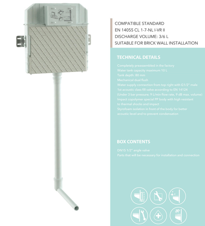 عملکرد بیصدا، دوام بالا، و سیستم تخلیه دوحالته (۳ یا ۶ لیتر) از ویژگیهای اصلی این مدل است. همچنین بدنه مقاوم در برابر حرارت و ضربه، همراه با عایق فوم، آن را به گزینهای مطمئن و بادوام تبدیل میکند.